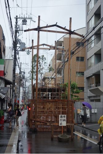 「豊園泉正寺榊(ほうえんおんまさかき)」は、神幸祭、還幸祭の神輿を先導します。もともと神輿三基の前をそれぞれ先導していた榊があったそうですが、これが唯一現存するものだそうです。東洞院仏光寺東入ル に、16日に建てられます。 今年は台風の影響も…